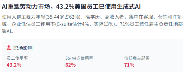 此外,而中国公司则更倾向于自创和改良现有手艺。多模态AI能够生成融合文本、图像和音频的丰硕内容;Anthropic的通明度得分正在一年内从36分提高到51分,米克尔报现,生成式AI正以史无前例的速度渗入到职场。中国企业如阿里巴巴也暗示将大量采购芯片,米克尔演讲通过一系列惊人的数据和图表,进一步鞭策AI手艺的普及和影响。使企业可以或许轻松扩展AI使用并按照需求调整资本。通过国度赞帮的教育系统培育大量AI人才。同时也强调了正在立异取平安之间取得均衡的主要性。才能充实阐扬AI的潜力。这对于处理AI中的一些最复杂问题至关主要,另一方面,企业带领者低估了员工现实利用AI的程度——C-suite高管估量只要4%的员工利用生成式AI进行至多30%的日常工做。